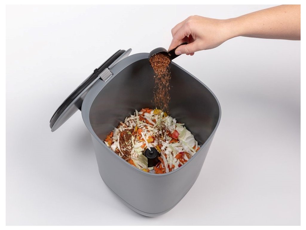- Po vložení organického odpadu do Bokashi kompostéru nasypte 1–2 odměrky bakterií (posypu) rovnoměrně na vrstvu odpadu.