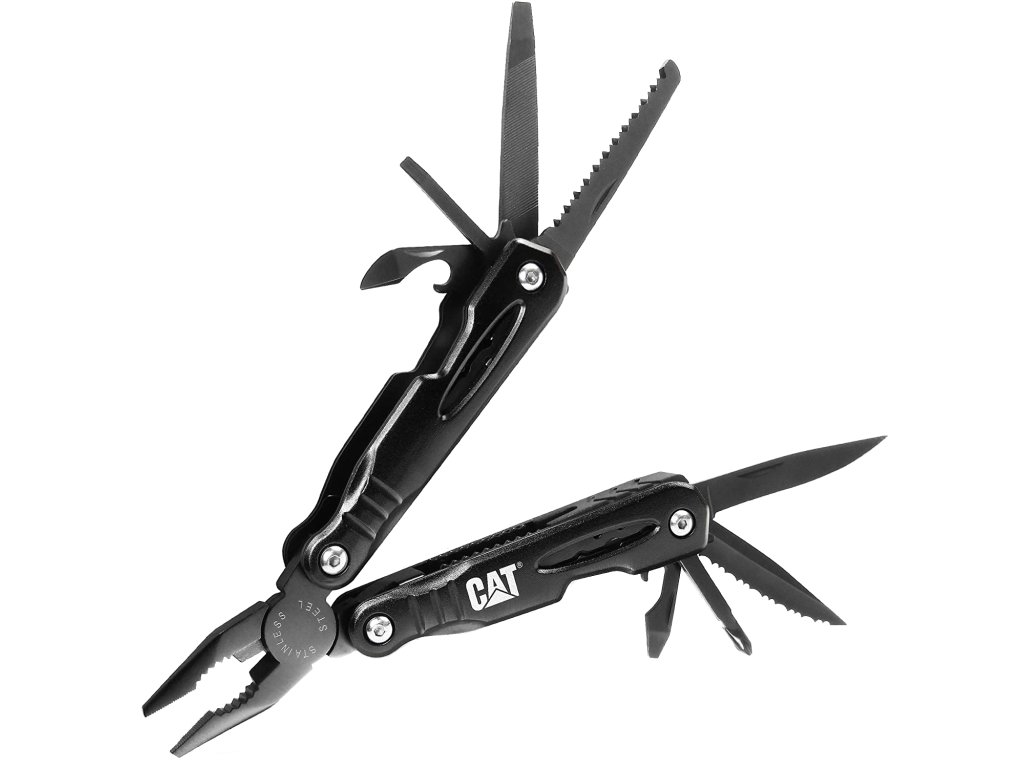 Tento multifunkční nástroj CAT® s 13 funkcemi je vybaven kleštěmi s dlouhým nosem, štípačkou drátu, otvírákem na láhve, velkým / středním / malým drážkovaným šroubovákem, zamykatelným velkým nožem, pilníkem s jedním řezem, pilníkem s dvojitým řezem, otvírákem na konzervy, zamykátelným vroubkovaným nožem a velkým nožem.
