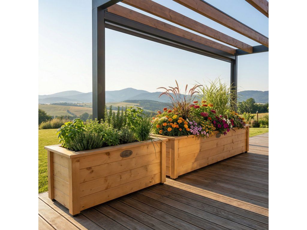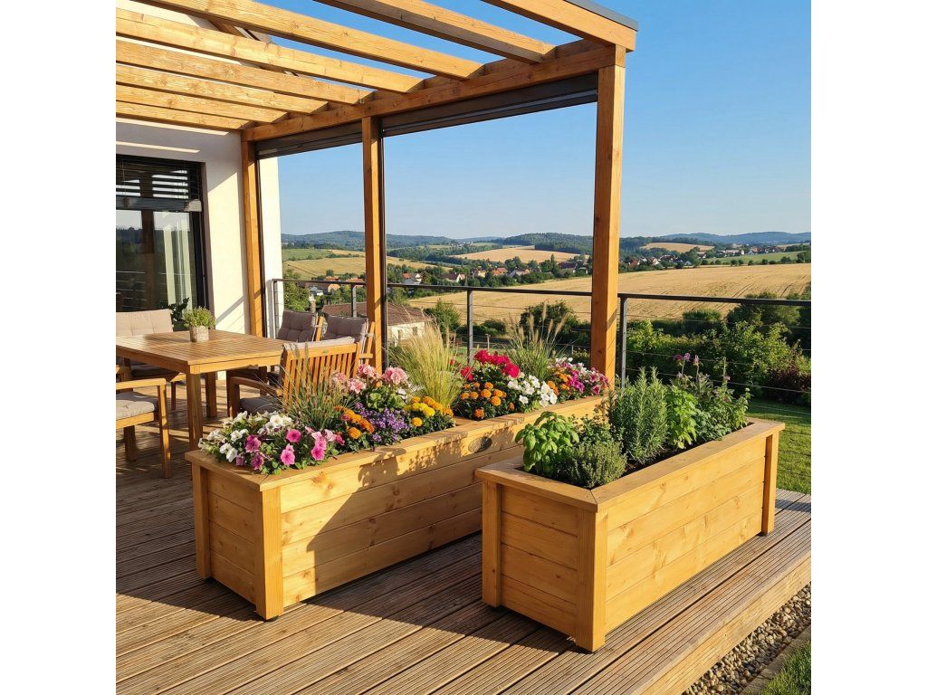 Povrch je ošetřen kvalitním olejovým nátěrem, který přirozenou kresbu smrku krásně vytáhne a zároveň dřevo ochrání před vlhkostí i UV zářením. Uvnitř dřevěného pláště najdete 2 kusy plastového truhlíku Terra 80 v antracitové barvě – mrazuvzdorný, snadno vyjímatelný, ideální pro zalévání i přesazování bez zbytečného nepořádku.