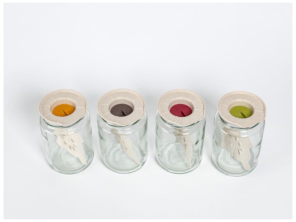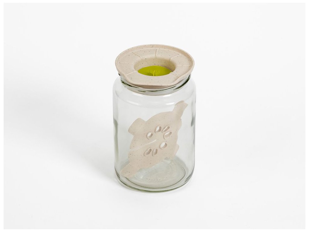 Zelené víčko kombinuje svěží bylinkový střed s okraji ze slonové kosti s kávovou sedlinou. Kávová sedlina prochází kaskádovou recyklací a slouží jako přírodní barvivo, výsledkem je jemná zrnitost a zemitý nádech. Vizuálně víčko odkazuje přímo na to, co fermentujete, a hezky vypadá vedle hrnků s bylinkami nebo na rustikální lince. Čirá sklenice obsah přehledně odkrývá a se zeleným víčkem tvoří přirozenou kombinaci.