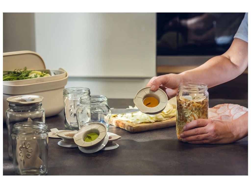 Víčko má jednocestný ventil, který při kvašení uvolňuje přebytečný CO₂, ale vzduch zvenčí dovnitř nepustí. Díky tomu zelenina fermentuje ve správném prostředí bez nutnosti cokoliv kontrolovat nebo přidávat.