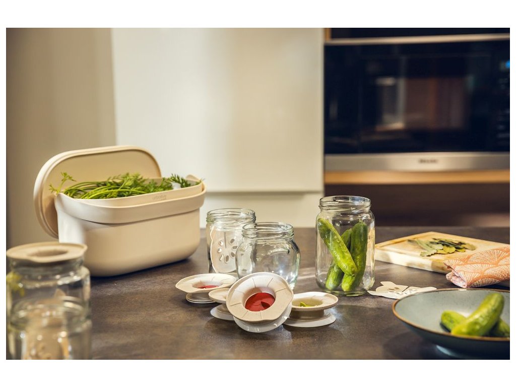 Víčko má jednocestný ventil, který při kvašení uvolňuje přebytečný CO₂, ale vzduch zvenčí dovnitř nepustí. Díky tomu zelenina fermentuje ve správném prostředí bez nutnosti cokoliv kontrolovat nebo přidávat.