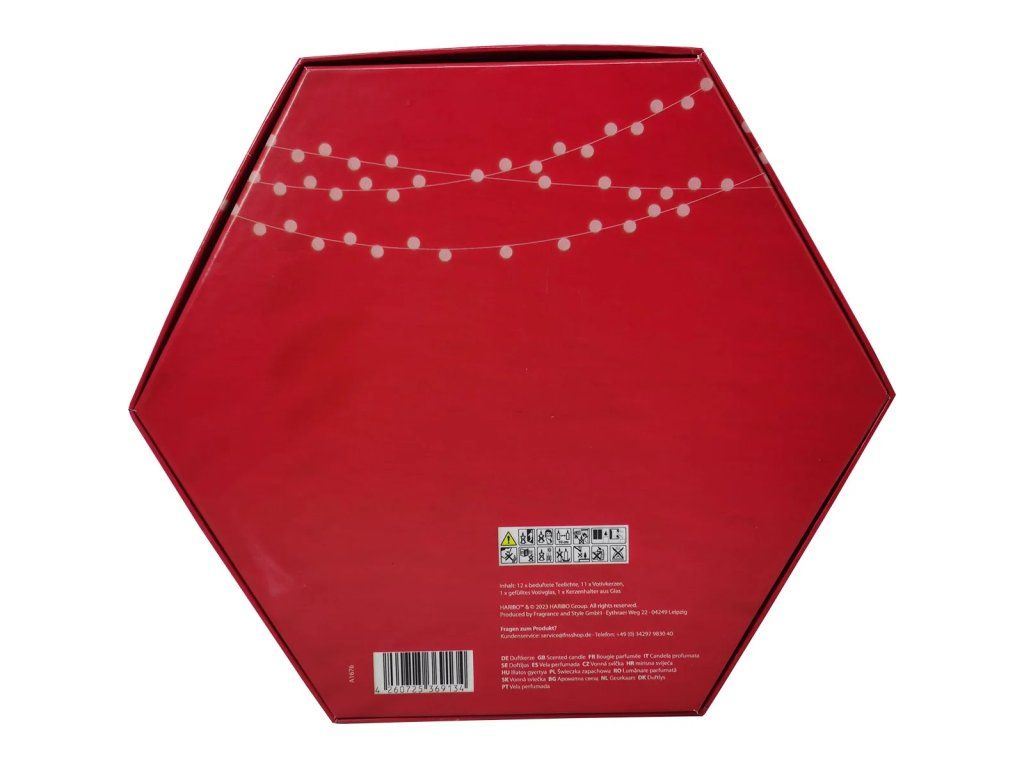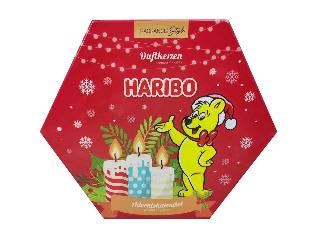 Adventní kalendář Haribo se svíčkami je originální kombinací oblíbené sladké značky a vonných svíček, která přináší do vašeho domova netradiční adventní atmosféru. Každý den až do Vánoc otevřete nové okénko s vonnou svíčkou inspirovanou kultovními příchutěmi Haribo – od červených jahod přes citrónové osvěžení až po sladkou malinovou vůni. Balení zdobí ikonický zlatý medvídek Haribo v čepici Santy, který vytváří veselou vánoční náladu. Kalendář obsahuje celkem 24 malých svíček v různých barevných skleničkách i bez, které společně vytvářejí pestrou vánoční dekoraci.