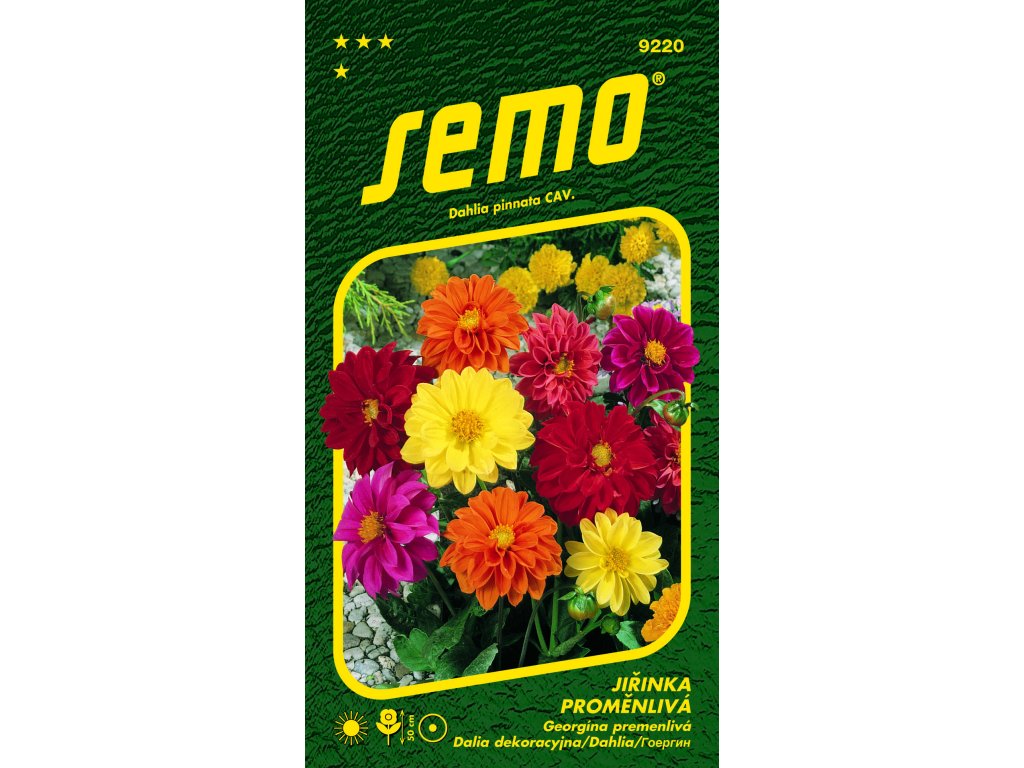 Směs šesti barev, velké plné květy, kompaktní rostliny výšky do 50 cm. Keřovitě rostoucí letnička vhodná na větší záhonové výsadby. Uplatní se i jako solitéra nebo pro řez květů do váz. Hlízy, které se vytváří během vegetace, můžeme na podzim vyjmout a uložit v bezmrazém prostředí. Vyžaduje slunné stanoviště a dobře provzdušněnou půdu. Bohatému kvetení napomáhá odstraňování odkvetlých úborů.