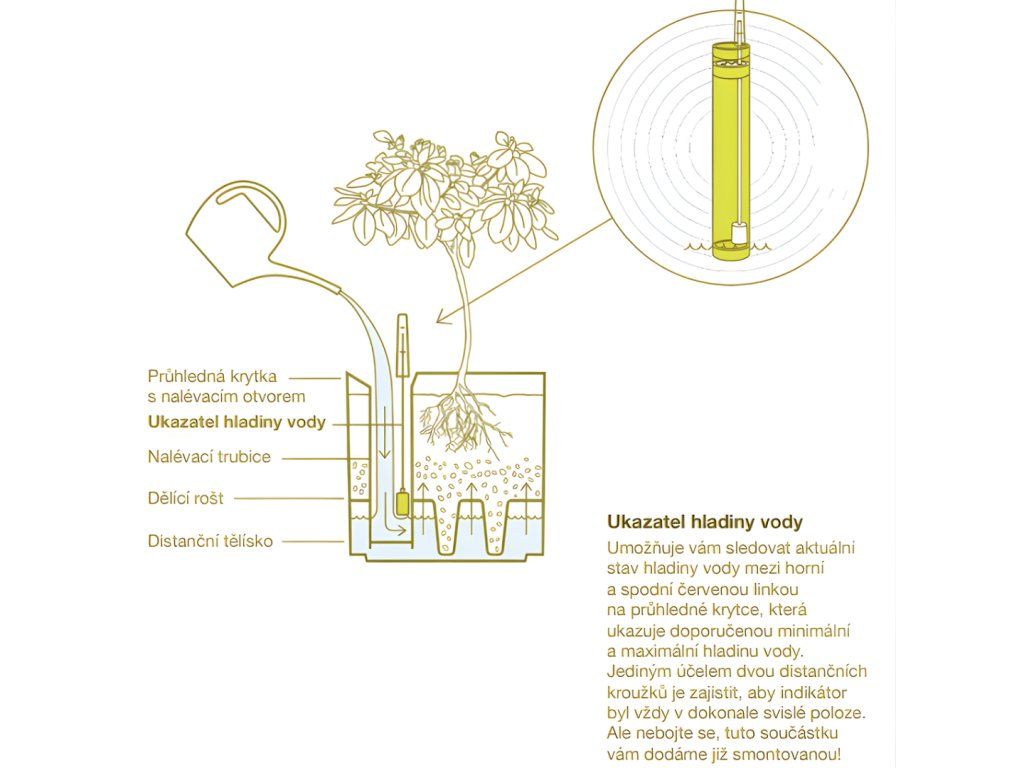 Systém Separator s kapacitou 7 litrů výrazně prodlužuje interval mezi doplňováními. Rošt oddělující zeminu od zásobníku chrání kořeny před přemokřením a vytváří podmínky blízké přirozenému prostředí rostliny.