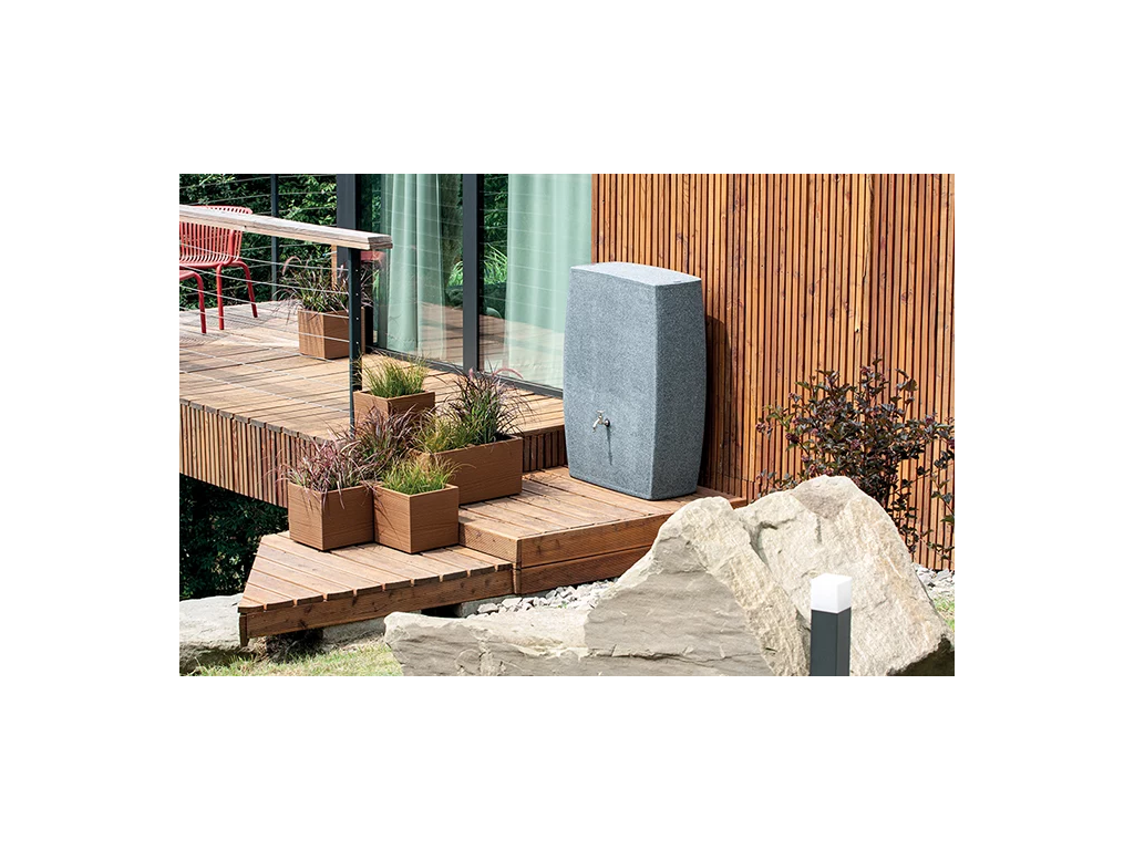 Truhlík je zhotoven z kvalitního plastu ECO Wood s texturou napodobující dřevo. Materiál odolává UV záření, teplotním výkyvům i venkovním podmínkám po celou sezónu – bez nutnosti sezonního uskladnění.