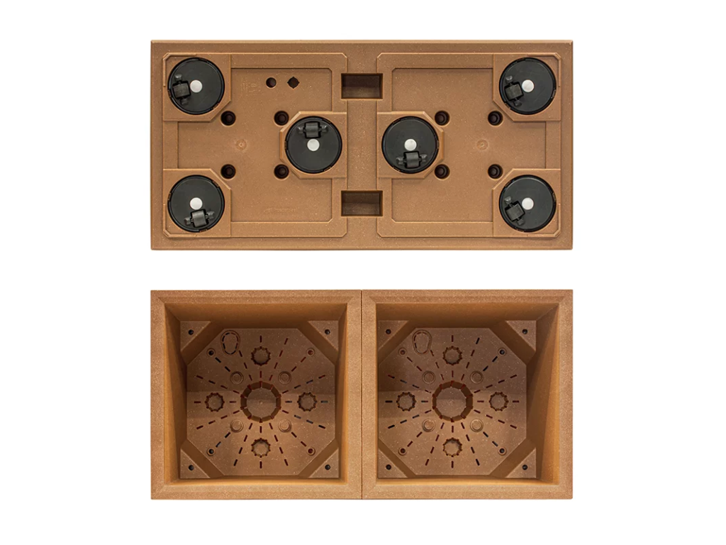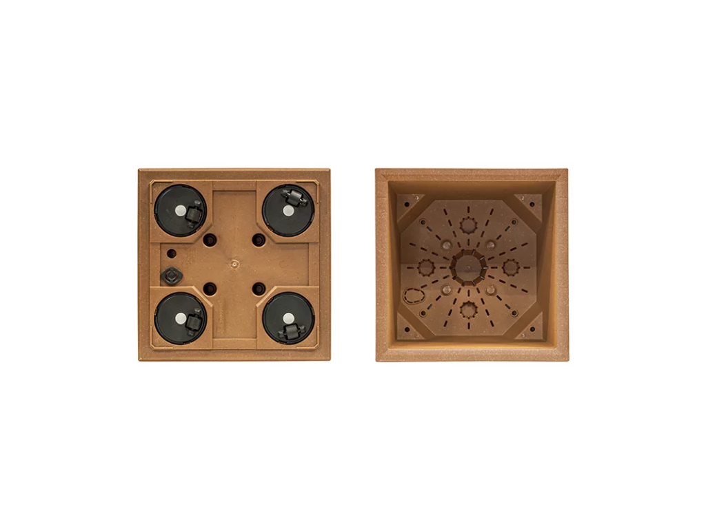 Truhlík je zhotoven z kvalitního plastu ECO Wood s texturou napodobující dřevo. Materiál odolává UV záření, teplotním výkyvům i venkovním podmínkám po celou sezónu – bez nutnosti sezonního uskladnění.