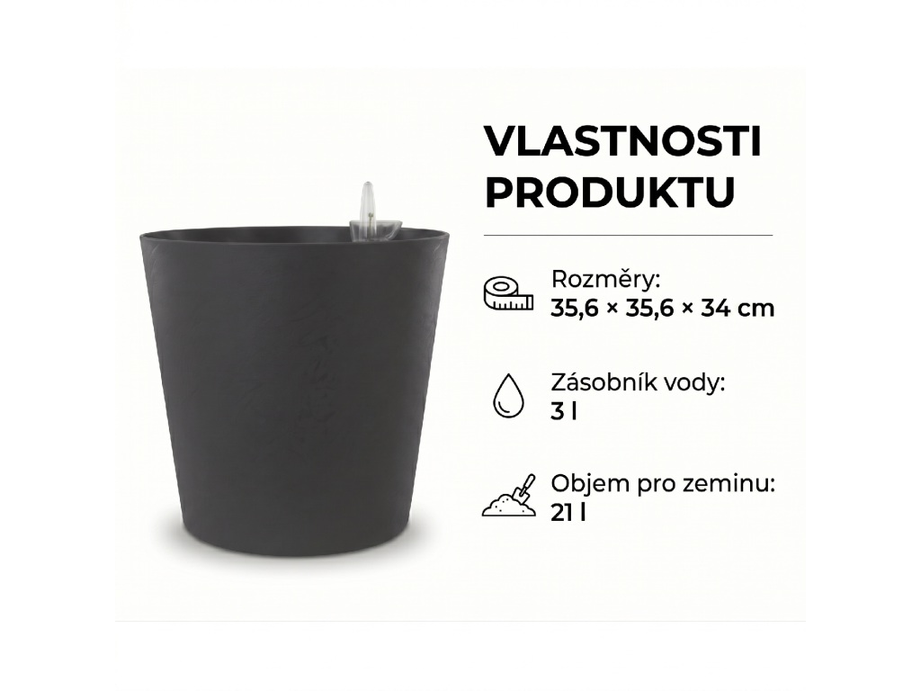Zásobník 3 litrů průběžně zásobuje rostlinu vodou bez každodenního zalévání. Perforovaný rošt odděluje zeminu od zásoby vody, kořeny se nepřemokřují a indikátor hladiny okamžitě ukáže, kdy je čas doplnit.