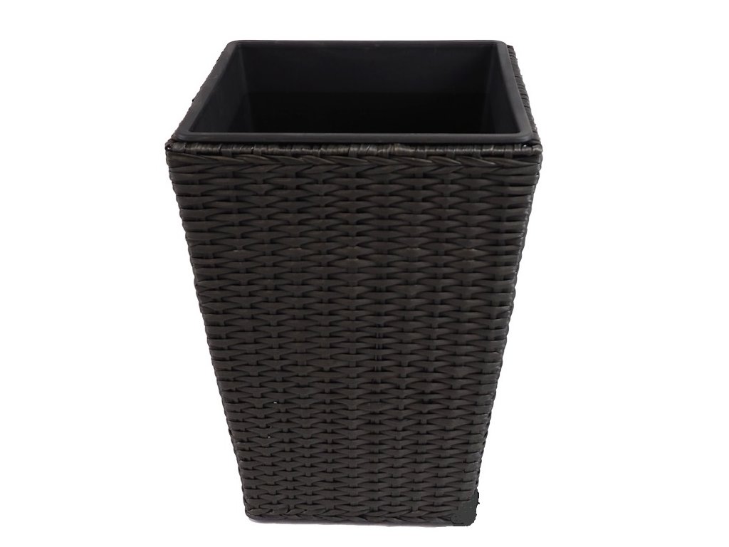Plastový čtverhranný květináč oplétaný tmavým vodním hyacintem - typu plast. Čtvercová základna, vyztužená kovovým rámečkem, který doplňují 4 šroubovací (výškově nastavitelné) nožičky, barva - tmavá, vnitřní plastový korpus - černý. Tato varianta květináčů je určena pro použití v interiéru i exteriéru (venkovní použití)!