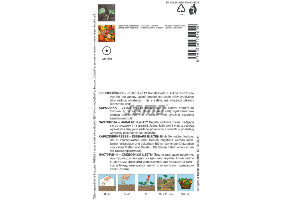 Květy ve směsi barev od krémově bílé, přes žlutou, oranžovou až po jasně červenou, patří mezi nejpopulárnější jedlé květy, mají výrazně pikantní řeřichovou chuť a vynikají jako ozdoba zeleninových salátů. Tinktura ze semen a poupat je považována za přírodní antibiotikum.