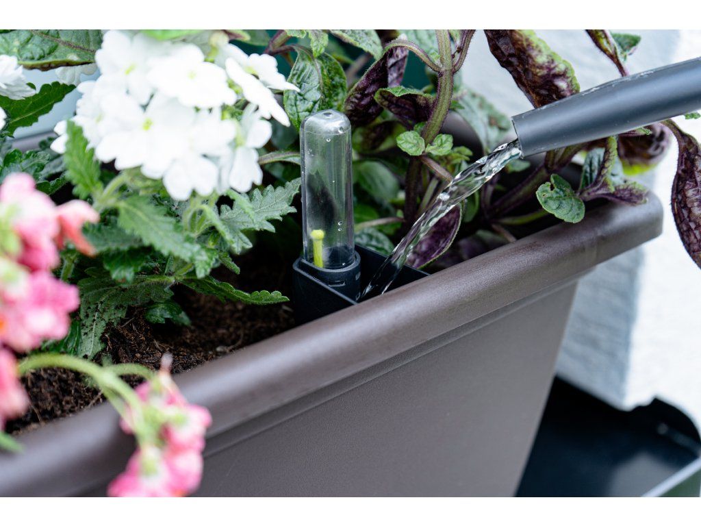 Truhlík má integrovaný zásobník vody, ze kterého si rostliny průběžně berou to, co potřebují – půda nevysychá náhle, ale udržuje stabilní vlhkost. Praktické je to hlavně v době dovolené, kdy na zalévání jednoduše není čas. Množství vody v zásobníku snadno zkontrolujete pomocí přiložené plnicí nálevky s ukazatelem hladiny: