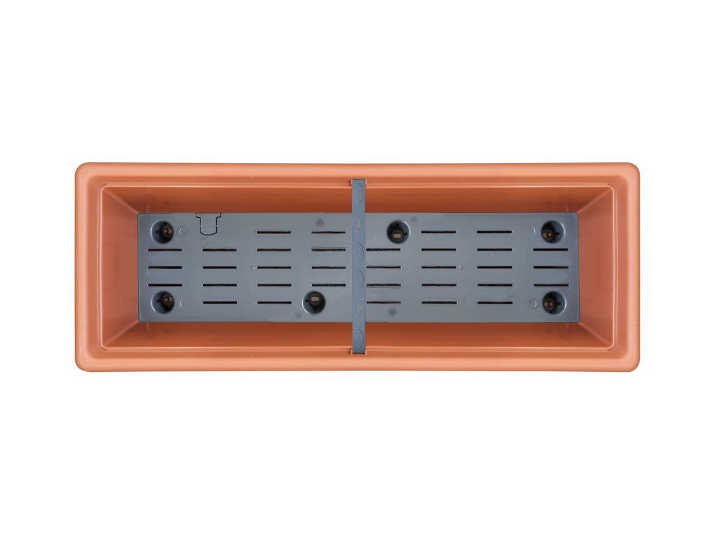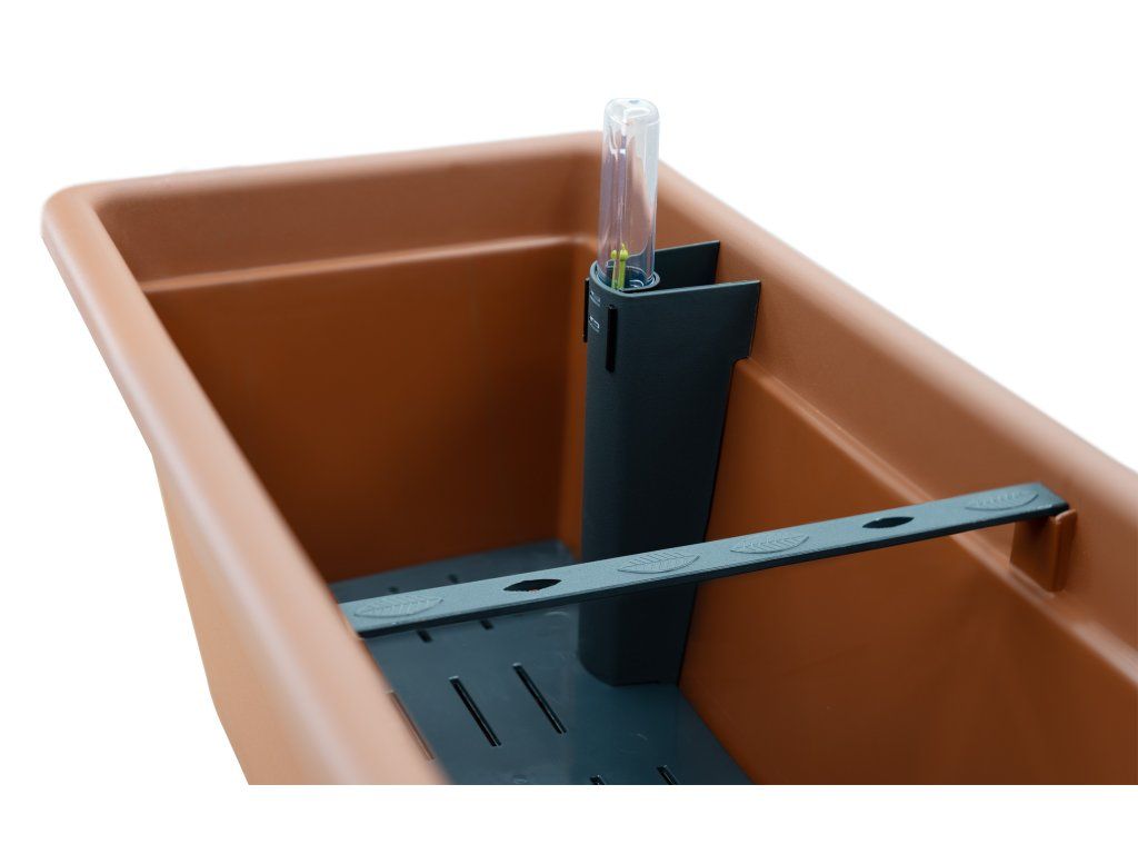 Truhlík má integrovaný zásobník vody, ze kterého si rostliny průběžně berou to, co potřebují – půda nevysychá náhle, ale udržuje stabilní vlhkost. Praktické je to hlavně v době dovolené, kdy na zalévání jednoduše není čas. Množství vody v zásobníku snadno zkontrolujete pomocí přiložené plnicí nálevky s ukazatelem hladiny: