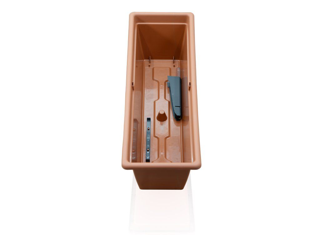 Truhlík má integrovaný zásobník vody, ze kterého si rostliny průběžně berou to, co potřebují – půda nevysychá náhle, ale udržuje stabilní vlhkost. Praktické je to hlavně v době dovolené, kdy na zalévání jednoduše není čas. Množství vody v zásobníku snadno zkontrolujete pomocí přiložené plnicí nálevky s ukazatelem hladiny: