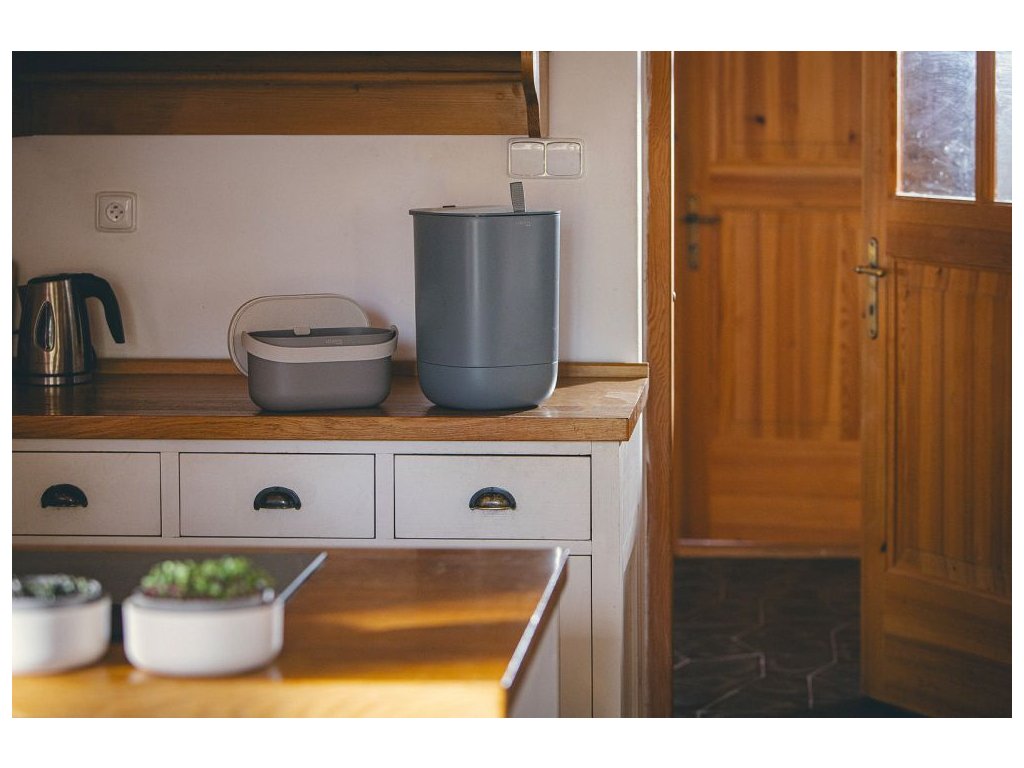 Do nádoby přistávají slupky z ovoce a zeleniny, kávový lógr, čajové sáčky i zbytky pečiva. Vše pak jednoduše odnesete na kompost nebo do hnědé popelnice – bez zbytečných cest po každém jídle.