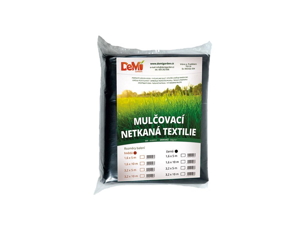 Mulčovací netkaná textilie – černá. Vlastnosti: 50 g/m2, odolná proti UV záření. Zamezuje nadměrnému výparu vody z půdy, zabraňuje prorůstání plevelů a znečištění plodů či rostlin od zeminy. Textilie se používá jako podkladová textilie pod dekorační materiály jako jsou mulčovací kůra, štěpka či oblázky při výsadbě okrasných rostlin, stromů a keřů.Doplňkové parametry