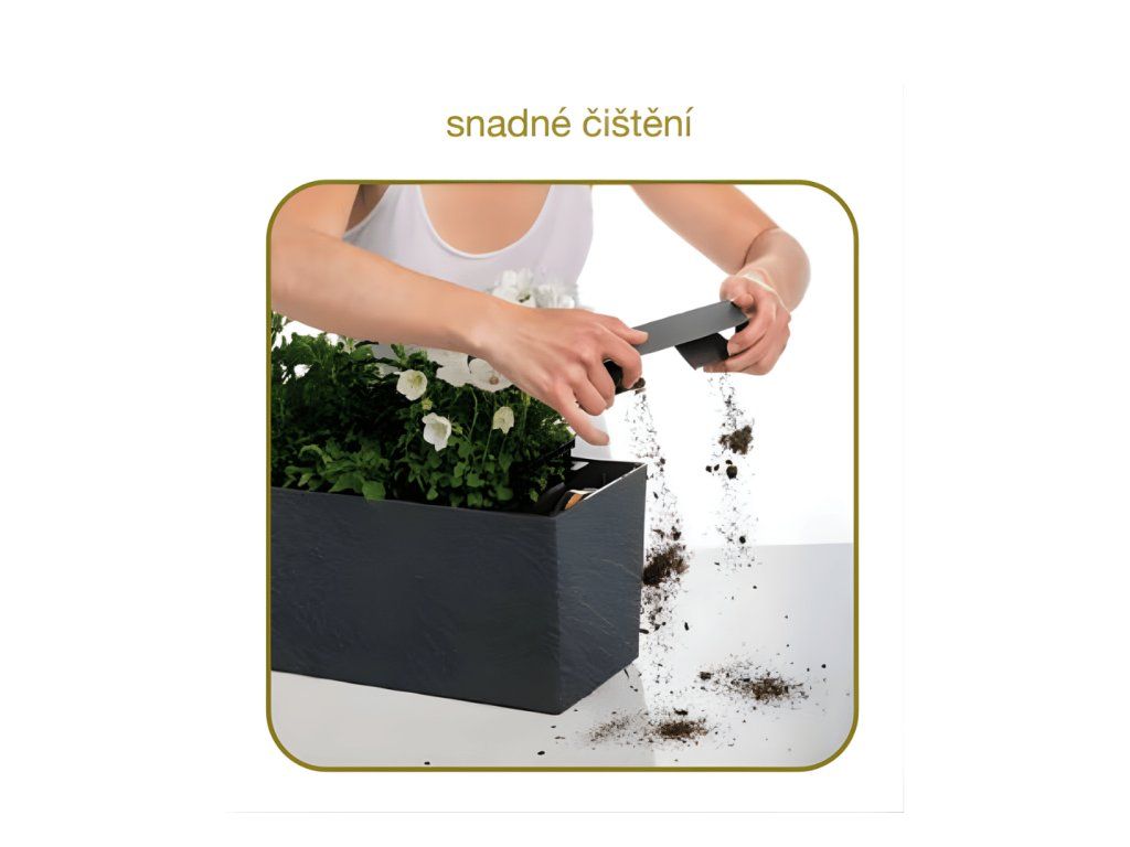 SUPREME STONE je truhlík, u kterého je vidět, že byl navržen s důrazem na detail. Texturovaný povrch imitující přírodní kámen, integrovaný samozavlažovací systém Hydro Power a vyjímatelná vnitřní nádoba – to vše dohromady tvoří produkt, který se hodí jak do moderního interiéru, tak na terasu nebo balkón. Rozměry 49,5 × 19 × 19 cm a zásobník na 3 litry vody z něj dělají praktické řešení pro pěstování bylinek, letniček i trvalek bez každodenního zalévání.