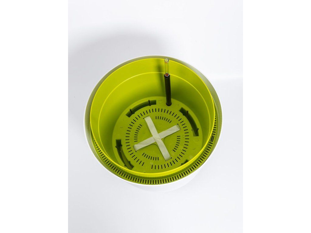 Vložka je obepnuta prstencovým zalévacím prostorem, do kterého přiléváte vodu – ta se přirozeně dostává ke kořenům a zároveň prostor zajišťuje přísun vzduchu, takže kořeny nezdusí. Zásobník pokryje potřeby rostliny na několik dní až týdnů podle druhu a ročního období.