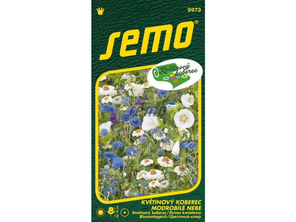 Směs letniček Modrobílé nebe z kolekce Květinový koberec je speciální směs 17 letniček v modré (např. chrpa, nestařec, šalvěj) a bílé barvě (např. cínie, slézovky). Tato směs letniček je vhodná především do volně komponované části zahrady. Výška Květinového koberce je 60 až 70 cm. Pěstujeme z přímých dubnových a květnových výsevů. Výsev směsi letniček Modré nebe doporučujeme do řádků 12 až 20 cm z důvodu snadnějšího odplevelení před zapojením porostu.
