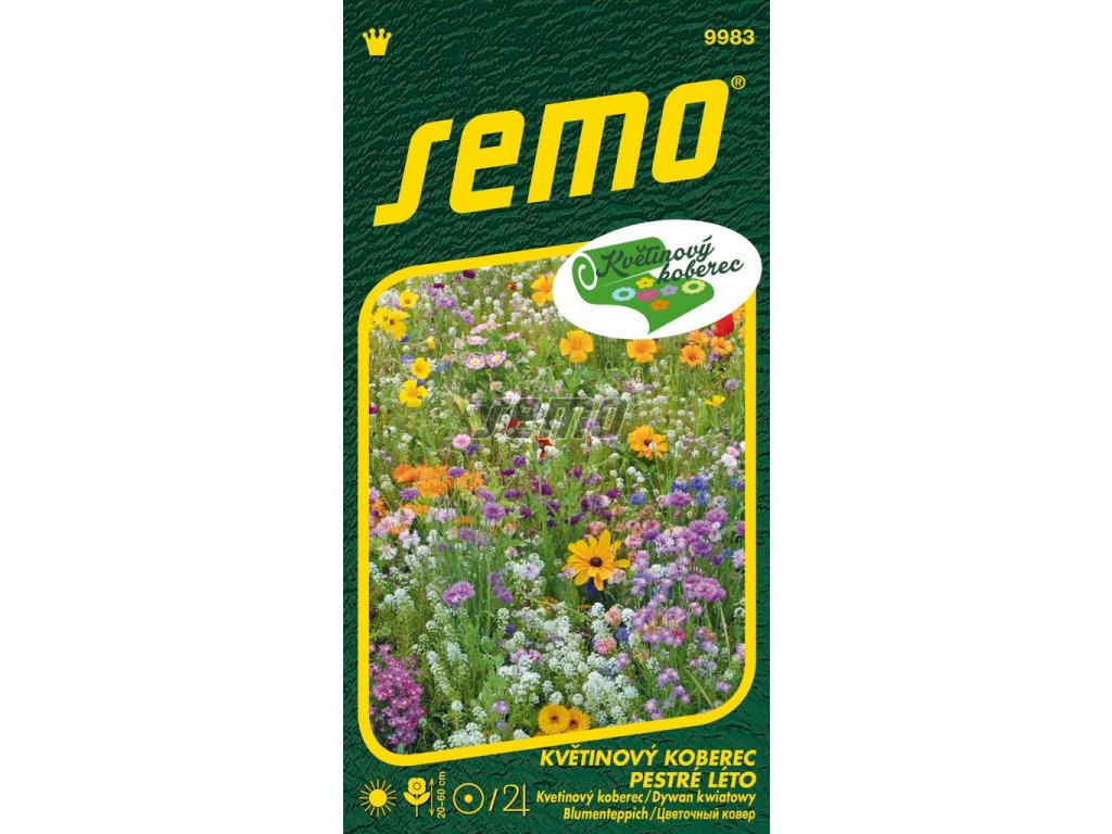 Směs květin Pestré léto je směs 16 druhů letniček a 17 trvalek vytváří nezaměnitelnou bohatost barev a variabilitu květů. Přesto barevný mix poměrně jemných odstínů navozuje pocit vzdušnosti a lehkosti, jaký nám přináší léto. To, že je léto i pestré a hravé, nám svou sytější barvou ukáže krásnoočko, hvozdík i chrpa. Vyséváme v dubnu až červnu nebo v září až listopadu. Doporučený výsevek pro jarní výsev 2 až 5 g/m2, pro podzimní 3 až 6 g/m2. Z jarního výsevu kvete směs od léta a pak následující roky od jara. Z podzimního výsevu kvete koncem jara a pak další roky. Výška květinového koberce je 20 až 60 cm.