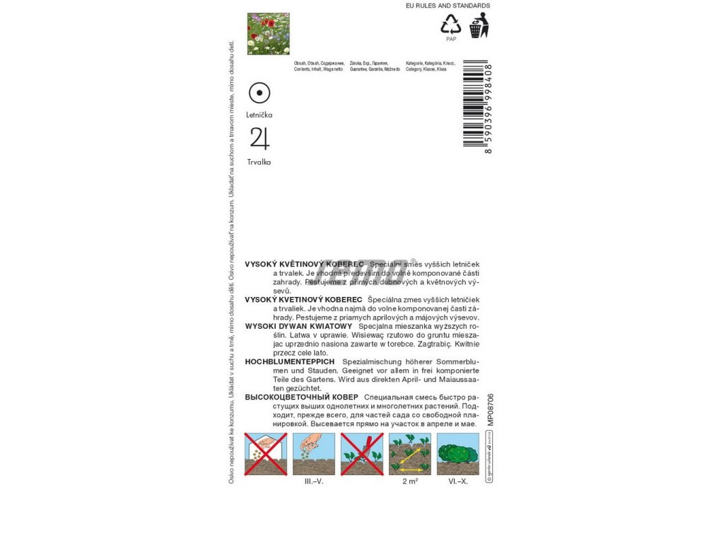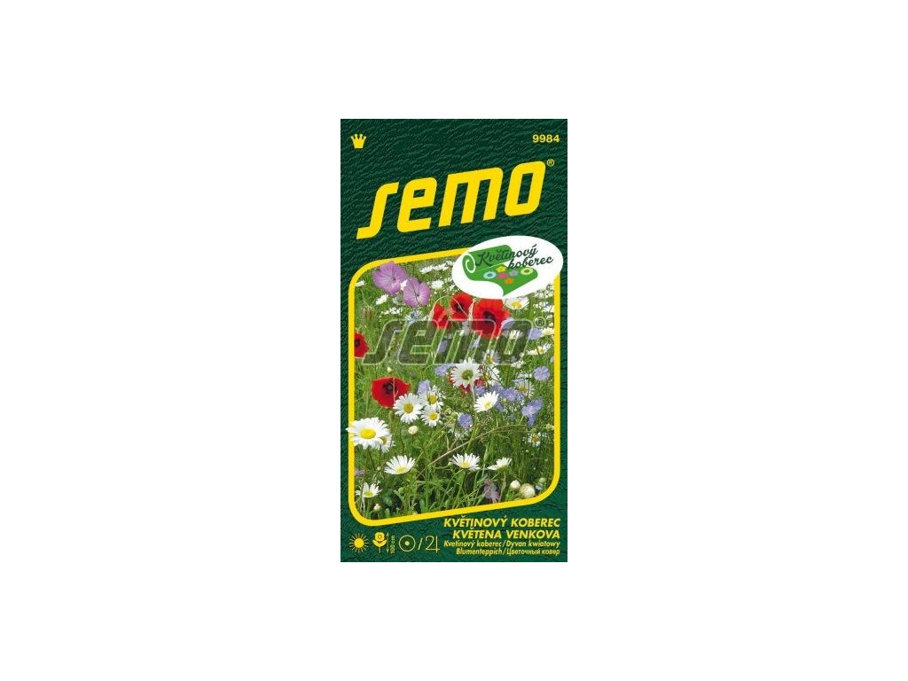 Květena venkova je přirozená směs 10 druhů letniček a 5 trvalek evokující vzpomínky na květiny našeho dětství. Kdo by neznal kopretiny, které ozdobí louku na přelomu května až června, Monetovy rudé vlčí máky a tajemstvím zahalený koukol. Jedná se o vyšší květinovou směs dosahující až 1 metru. Květenu venkova vyséváme v březnu až červnu nebo od září do listopadu. Doporučený výsevek pro jarní výsev je 2 až 5 g/m2, pro podzimní zase 3 až 6 g/m2. Z jarního výsevu kvete od léta a pak následující roky od jara. Výška květinového koberce je 50 až 100 cm.Složení směsiSložení směsi je vlčí mák, chrpa luční, chryzantémovka (zlateň osenní), kopretina bílá, plamenka (flox), koukol polní, atd.Doplňkové parametry