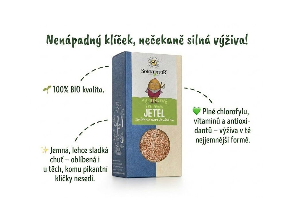 Jetel, nenápadný klíček s velkým obsahem živin. Jetelové klíčky mají jemnou, lehce sladkou chuť a patří k nejbohatším zdrojům chlorofylu mezi klíčky. Výborně se hodí do salátů, dipů, pomazánek, na sendviče i jako jemná ozdoba pokrmů. BIO semínka jetele od Sonnentoru můžete využít na klasické klíčení i na pěstování microgreens.