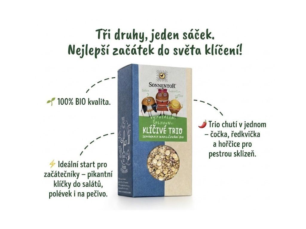 Tři oblíbené druhy v jednom balení, ideální start do světa klíčení. Klíčivé trio od Sonnentoru kombinuje čočku, ředkvičku a hořčici, které se svými chutěmi skvěle doplňují. Výsledkem jsou pikantní, kořeněné klíčky s pestrým chuťovým profilem, které ozvláštní každý pokrm. Semínka jsou v certifikované BIO kvalitě.