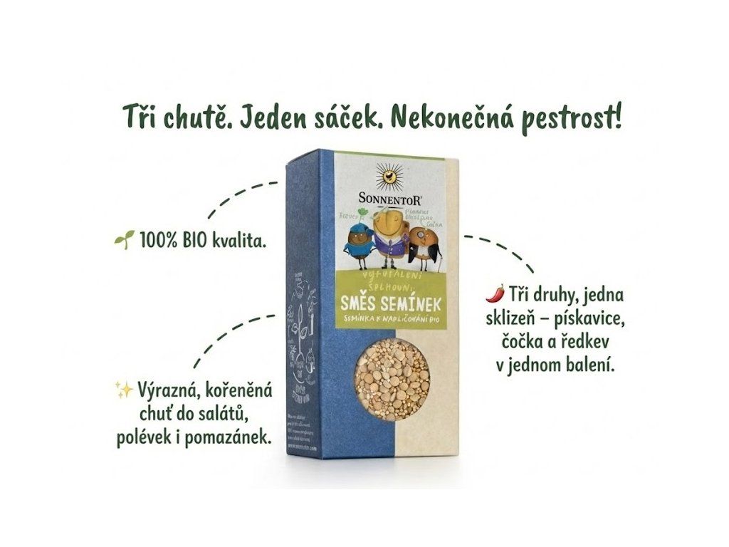 Tři chutě v jednom balení, pro ty, kdo chtějí pestrost. Směs semínek od Sonnentoru kombinuje pískavici řecké seno, čočku a ředkev. Každý druh přináší svůj charakteristický tón – kořeněnou pískavici s nádechem kari, jemnou čočku a pikantní ředkev. Výsledkem jsou klíčky s výraznou, bohatou chutí, které ozvláštní jakýkoli pokrm. Semínka jsou v certifikované BIO kvalitě.