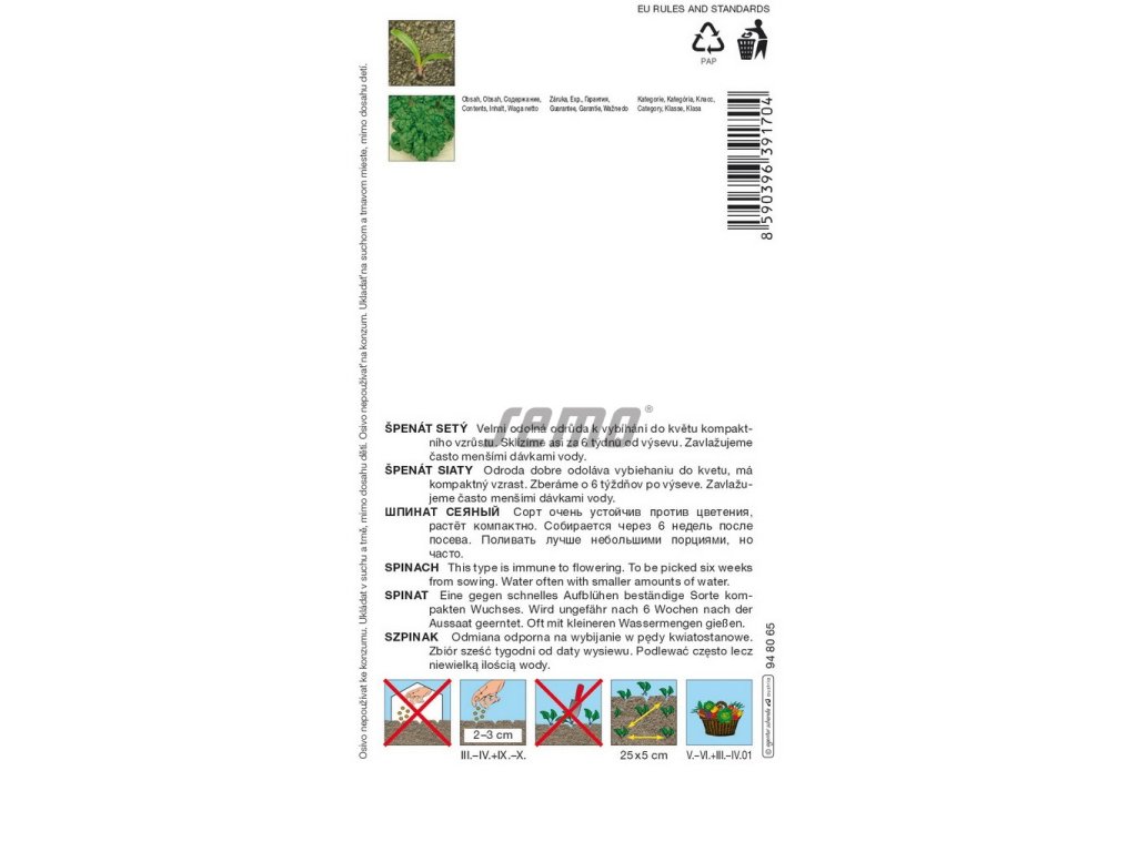 Špenát – nejvhodnější pro pěstování špenátu jsou hlinitopísčité, dostatečně vododržné půdy s pH 6 až 7,5. Špenát nesnáší suché a kyselé půdy a větrné polohy. Jarní kulturu z březnových výsevů sklízíme 5 až 6 týdnů po výsevu. Jako následnou plodinu ze srpnových výsevů sklízíme v září až v říjnu. Pro přezimování a ranou jarní sklizeň vyséváme v září.