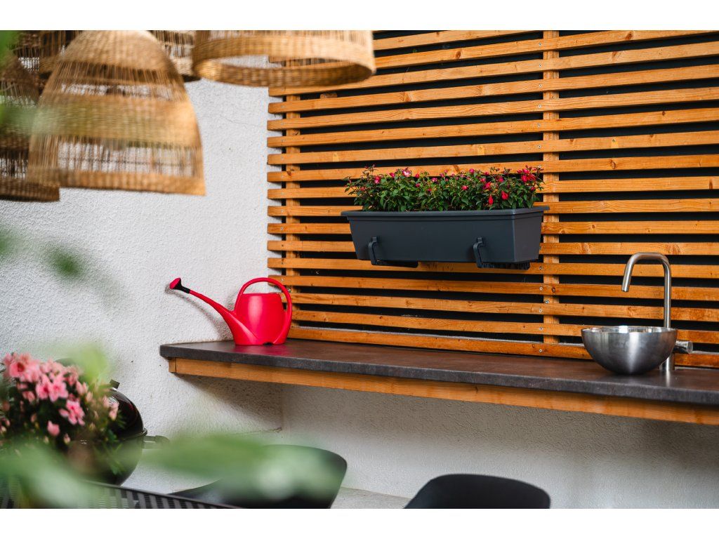 Truhlík má integrovaný zásobník vody, ze kterého si rostliny průběžně berou to, co potřebují – půda nevysychá náhle, ale udržuje stabilní vlhkost. Praktické je to hlavně v době dovolené, kdy na zalévání jednoduše není čas. Množství vody v zásobníku snadno zkontrolujete pomocí přiložené plnicí nálevky s ukazatelem hladiny: