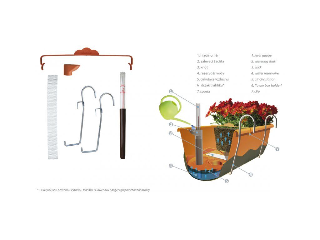 Truhlík obsahuje: hladinoměr pro měření hladiny vody, nalévací otvor, zásobník na vodu, knoty a sponu.