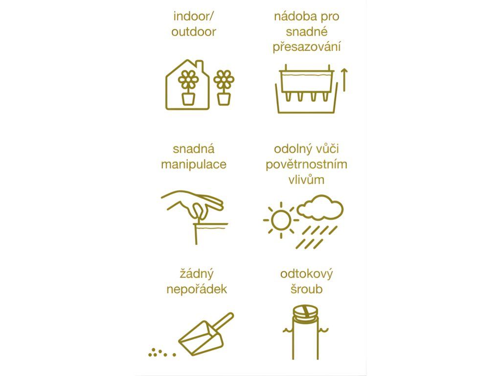 Nádoba je standardně vybavena zátkou přepadu pro odtok dešťové vody – stačí ji odšroubovat a truhlík je připravený pro venkovní použití. Materiál odolává UV záření i povětrnostním podmínkám. Při použití uvnitř zátka zůstane na místě a zásobník odvede přebytečnou vláhu řízeně.