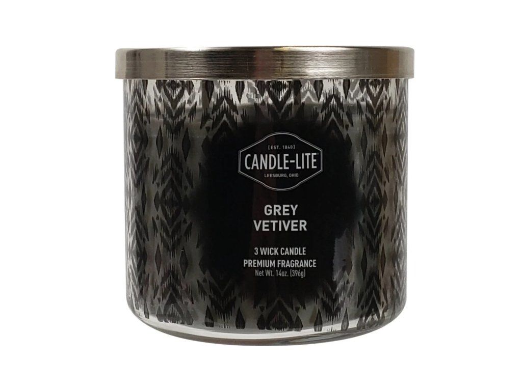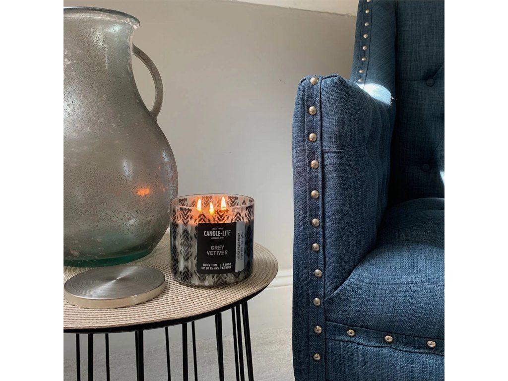 Vonná svíčka Grey Vetiver od Candle-lite přináší vytříbenou eleganci a hloubku exotických dřevin.