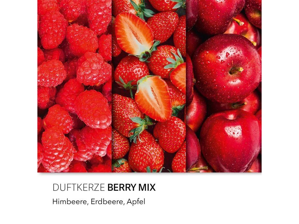 Haribo svíčka Berry Mix otevírá jemnou symfonií jahod a malin, které ihned vyvolávají pocit letní svěžesti. Postupně se rozvíjí srdce plné bobulí, broskví, růží a hroznového vína, které dodává kompozici hloubku a eleganci. Základní tóny pačuli, vanilky a pižma uzavírají celou skladbu hřejivým a smyslným závěrem. Tato sójová inspirovaná svíčka vytváří harmonickou atmosféru, která je zároveň ovocná i jemně květinová.