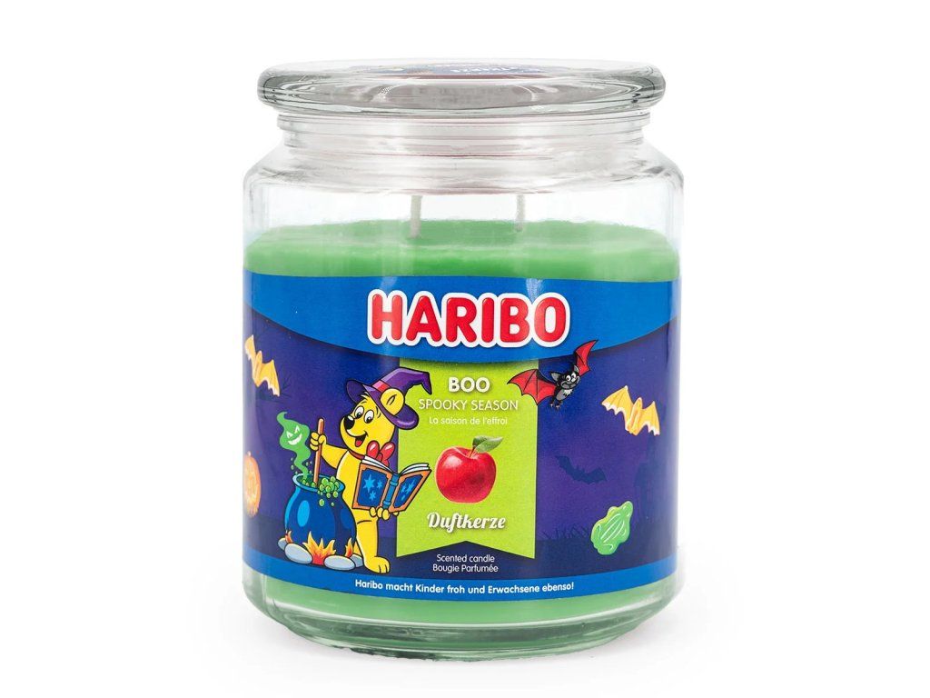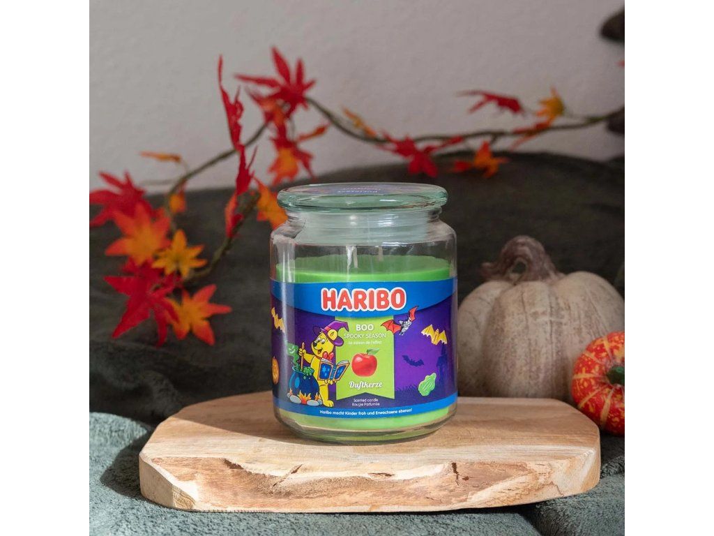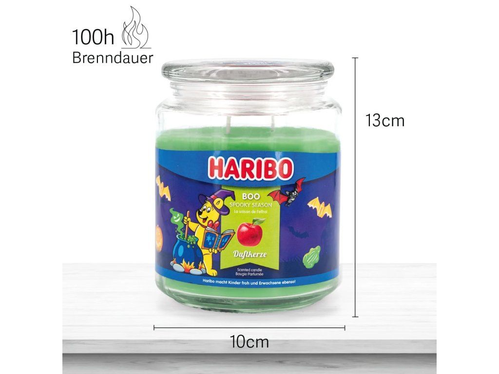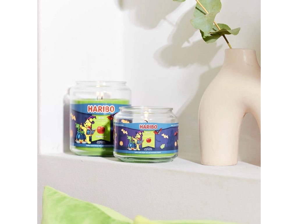 - Velká skleněná vonná svíčka Haribo Boo 510 g s dlouhou dobou hoření až 100 hodin.