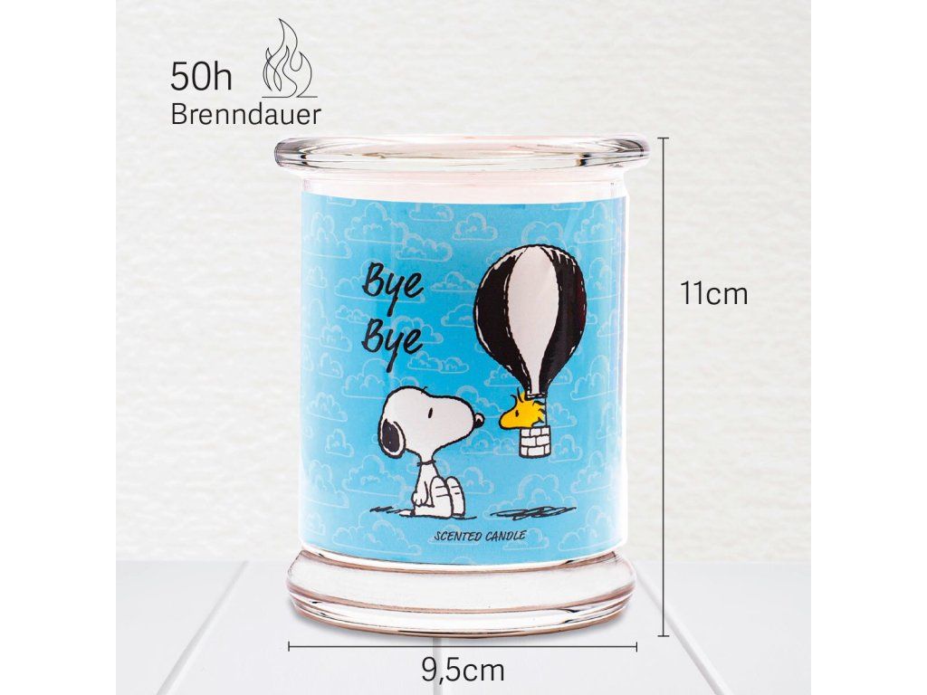 Skleněná nádoba v uklidňující modré barvě symbolizuje nekonečnost nebe a moře – elementy, které spojují i na dálku. Dekorace s oblíbenými postavičkami Peanuts včetně Snoopyho dodává svíčce hravý a zároveň emotivní charakter. Po dohoření se modrá sklenice promění v elegantní svícen nebo úložný prostor na drobné vzpomínkové předměty, které vám připomenou milované osoby.